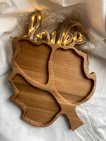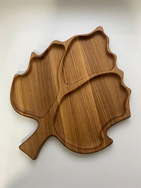 На выставке ChristmasBox Podarki 2026 компания LazerZlat представляет новинку – менажницу в форме кленового листа из цельного ясеня. Эта большая деревянная посуда идеально подходит для сервировки праздничного стола и может использоваться для подачи сыров, закусок, фруктов и других блюд. Изделие отшлифовано вручную и покрыто минеральным маслом-воском премиум-класса для долговечности. Уникальный окрас древесины варьируется от светло- до темно-коричневого, что делает каждую менажницу неповторимой.